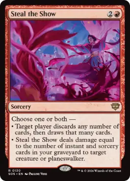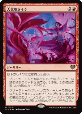以下から1つまたは両方を選ぶ。 ・プレイヤー1人を対象とする。そのプレイヤーは望む枚数のカードを捨てる。その後、その枚数に等しい枚数のカードを引く。 ・クリーチャーやプレインズウォーカーである1体を対象とする。人気をさらうはそれに、あなたの墓地にあり、インスタントやソーサリーであるカードの枚数に等しい点数のダメージを与える。 |