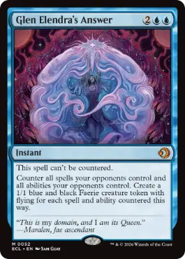 この呪文は打ち消されない。 対戦相手がコントロールしているすべての呪文と対戦相手がコントロールしているすべての能力を打ち消す。これにより打ち消された、呪文と能力の合計に等しい数の、飛行を持つ青黒の1/1のフェアリー・クリーチャー・トークンを生成する。 |