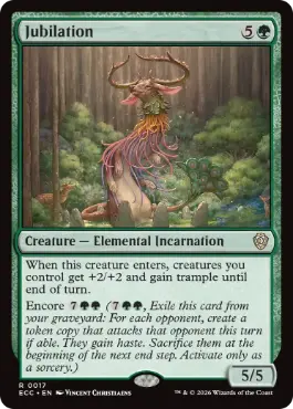 このクリーチャーが戦場に出たとき、ターン終了時まで、あなたがコントロールしているすべてのクリーチャーは+2/+2の修整を受けトランプルを得る。 再演{7GG}({7GG}, あなたの墓地にあるこのカードを追放する:各対戦相手につきそれぞれ、このカードのコピーであり、このターン可能ならそのプレイヤーを攻撃するトークン1体を生成する。それらは速攻を得る。次の終了ステップの開始時に、それらを生け贄に捧げる。起動はソーサリーとしてのみ行う。) |