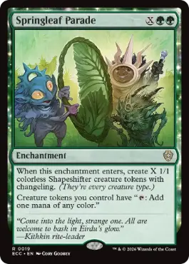 このエンチャントが戦場に出たとき、多相を持つ無色の1/1の多相の戦士・クリーチャー・トークンX体を生成する。(それらはすべてのクリーチャー・タイプである。) あなたがコントロールしているすべてのクリーチャー・トークンは「{T}:好きな色1色のマナ1点を加える。」を持つ。 |