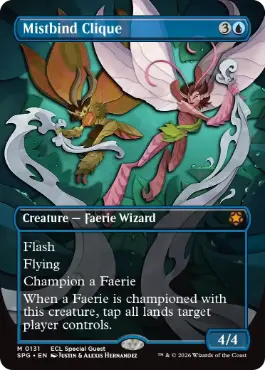 瞬速 飛行 覇権(フェアリー(Faerie))(これが戦場に出たとき、あなたがコントロールする他のフェアリー1つを追放しないかぎり、これを生け贄に捧げる。これが戦場を離れたとき、そのカードは戦場に戻る。) いずれかのフェアリーが霧縛りの徒党により覇権させられたとき、プレイヤー1人を対象とし、そのプレイヤーがコントロールするすべての土地をタップする。 |