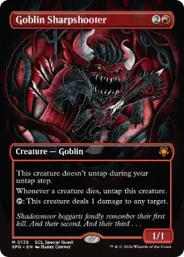 ゴブリンの名手は、あなたのアンタップ・ステップにアンタップしない。 クリーチャー1体が死亡するたび、ゴブリンの名手をアンタップする。 (T):クリーチャー1体かプレイヤー1人を対象とする。ゴブリンの名手はそれに1点のダメージを与える。 |