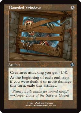 あなたを攻撃しているすべてのクリーチャーは-1/-0の修整を受ける。 各終了ステップの開始時に、このターンにあなたが4点以上のダメージを受けていた場合、板塞ぎの窓を追放する。 |