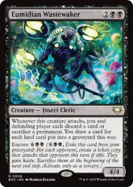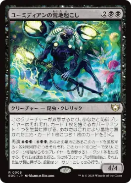 このクリーチャーが攻撃するたび、あなたと防御プレイヤーはそれぞれ、カード1枚を捨てるかパーマネント1つを生け贄に捧げる。あなたはこれにより墓地に置かれた土地・カード1枚につき1枚のカードを引く。 再演{6}{B}{B}{B}{B}({6}{B}{B}{B}{B},あなたの墓地にあるこのカードを追放する:各対戦相手につきそれぞれ、このカードのコピーであるトークン1体であり、このターン可能ならそのプレイヤーを攻撃するトークン1体を生成する。それらは速攻を得る。次の終了ステップの開始時に、それらを生け贄に捧げる。起動はソーサリーとしてのみ行う。) |