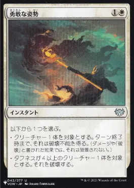 以下から1つを選ぶ。 • クリーチャー1体を対象とする。ターン終了時まで、それは破壊不能を得る。 • タフネスが4以上のクリーチャー1体を対象とする。それを破壊する。 |