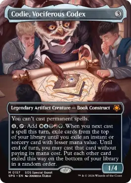 あなたはパーマネント・呪文を唱えられない。 {4}, {Tap}:{White}{Blue}{Black}{Red}{Green}を加える。このターンにあなたが次に呪文を唱えたとき、マナ総量がそれより小さくインスタントやソーサリーであるカード1枚が追放されるまで、あなたのライブラリーの一番上から1枚ずつ追放していく。ターン終了時まで、あなたはそのカードをマナ・コストを支払うことなく唱えてもよい。これにより追放された、他のすべてのカードをあなたのライブラリーの一番下に無作為の順番で置く。 |