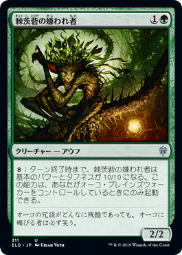 | カードテキスト | {8}:ターン終了時まで、棘茨砦の嫌われ者は基本のパワーとタフネスが10/10になる。この能力は、あなたがオーコ・プレインズウォーカーをコントロールしているときにのみ起動できる。 |