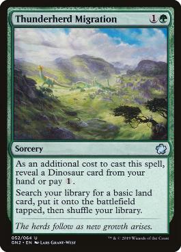 この呪文を唱えるための追加コストとして、あなたの手札にある恐竜・カード1枚を公開するか{1}を支払う。 あなたのライブラリーから基本土地・カード1枚を探し、タップ状態で戦場に出す。その後、ライブラリーを切り直す。 |