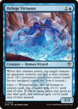 このクリーチャーが戦場に出たとき、対戦相手がコントロールしているクリーチャー1体を対象とする。それをタップし、それの上に麻痺カウンター1個を置く。(麻痺カウンターが置かれているパーマネントがアンタップ状態になるなら、代わりにそれの上から麻痺カウンター1個を取り除く。) 演目 ― あなたがインスタントやソーサリーである呪文1つを唱えるたび、ターン終了時まで、このクリーチャーは+1/+1の修整を受ける。その呪文を唱えるために5点以上のマナが支払われていたなら、代わりに、ターン終了時まで、このクリーチャーは+2/+2の修整を受ける。 |