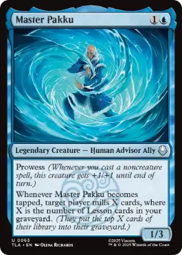 果敢(あなたがクリーチャーでない呪文1つを唱えるたび、ターン終了時まで、このクリーチャーは+1/+1の修整を受ける。) パク師がタップ状態になるたび、プレイヤー1人を対象とする。そのプレイヤーはカードX枚を切削する。Xは、あなたの墓地にある講義・カードの枚数に等しい。(そのプレイヤーは、自分のライブラリーの一番上にあるカードX枚を自分の墓地に置く。) |