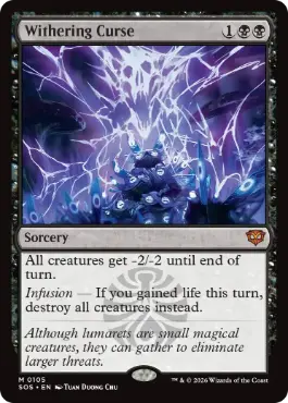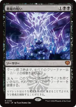 ターン終了時まで、すべてのクリーチャーは-2/-2の修整を受ける。 注入 ― このターンにあなたがライフを得ていたなら、代わりに、すべてのクリーチャーを破壊する。 |